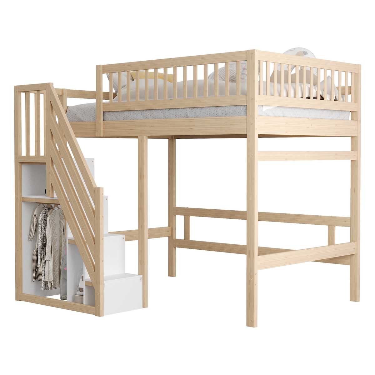 OKWISH Massivholzbett 140x200 mit Stauraumtreppe hohes Sicherheitsgeländer platzsparendes Design robust langlebig Kiefernholz elegant Naturholzfarbe