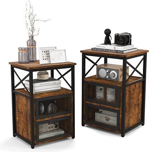 COSTWAY Beistelltisch, schwarz, Nachttisch mit 2 ausziehbaren Schubladen und offenem Regal, Nachttisch aus Holz