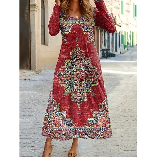 Per donna Abito maxi Tubino Vestito T-Shirt Vacanza Casual Boho Ferie Data Vestibilità regolare Grafico Geometrico Tribale Manica Lunga Girocollo Blu Marrone Scuro Nero Rosso Primavera Autunno