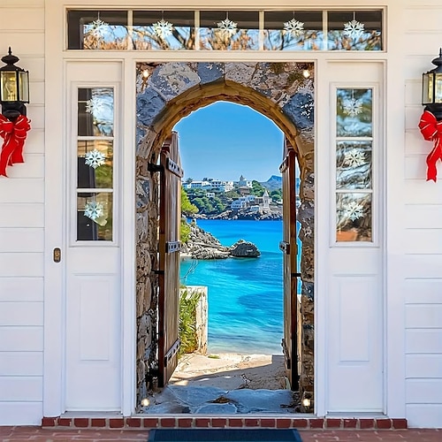 Striscione per porta con vista sulla spiaggia mediterranea, 3D, arco in pietra, paesaggio tropicale dell'oceano, arazzo da parete per ingresso, camera da letto, arredamento per la casa