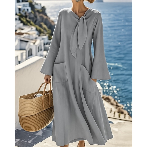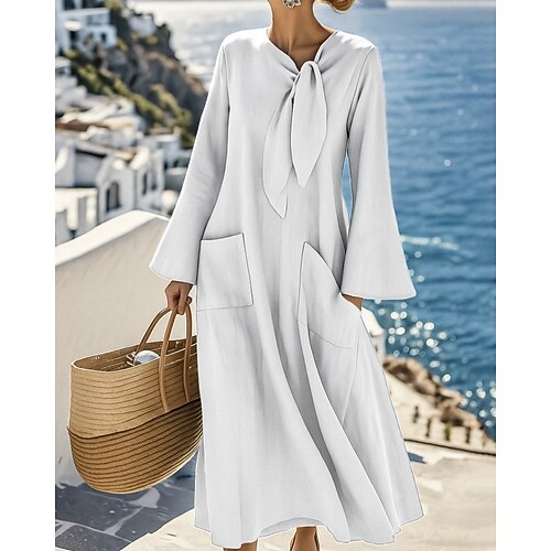 Per donna Abito Midi Abito in cotone e lino Moda Moderno Quotidiano All'aperto Vacanza Vestibilità comoda Semplice Manica Lunga Girocollo Bianco Verde chiaro Rosa Azzurro Estate Primavera Autunno