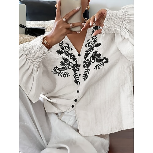 Per donna Camicia popover Camicia casual Blusa Ricamato Bottoni Floreale Elegante Casual Manica Lunga Scollo a V Top Regolari Quotidiano All'aperto Ferie Bianco Primavera Autunno Inverno