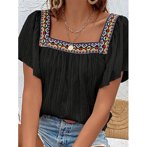 Per donna Camicia Boho Top estivi Blusa Top Eleganti Arricciato Volant Patchwork Semplice Elegante Vintage Signore Manica Corta Collo quadrato Top Regolari Quotidiano Lavoro Ferie Blu Nero Bianco Rosa