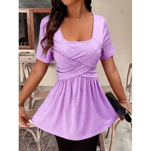 Per donna Maglietta Arricciato Patchwork Tinta unica Moda Casual Manica Corta Collo quadrato Top lunghi Quotidiano Uscire Weekend Marrone Scuro Nero Verde chiaro Vino Viola Estate Primavera