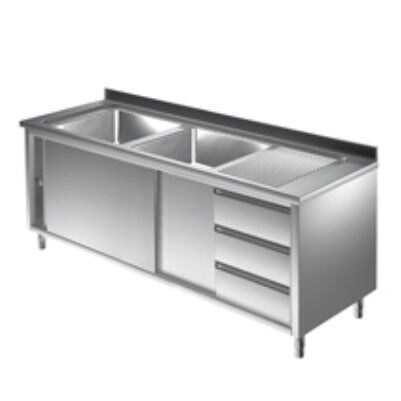 VM Europa Edelstahl Spülschrank 2 Becken links, mit Aufkantung, 3 Schubladen rechts, Premium - montiert: 140 x 70 cm / mit Aufkantung / fertig montiert
