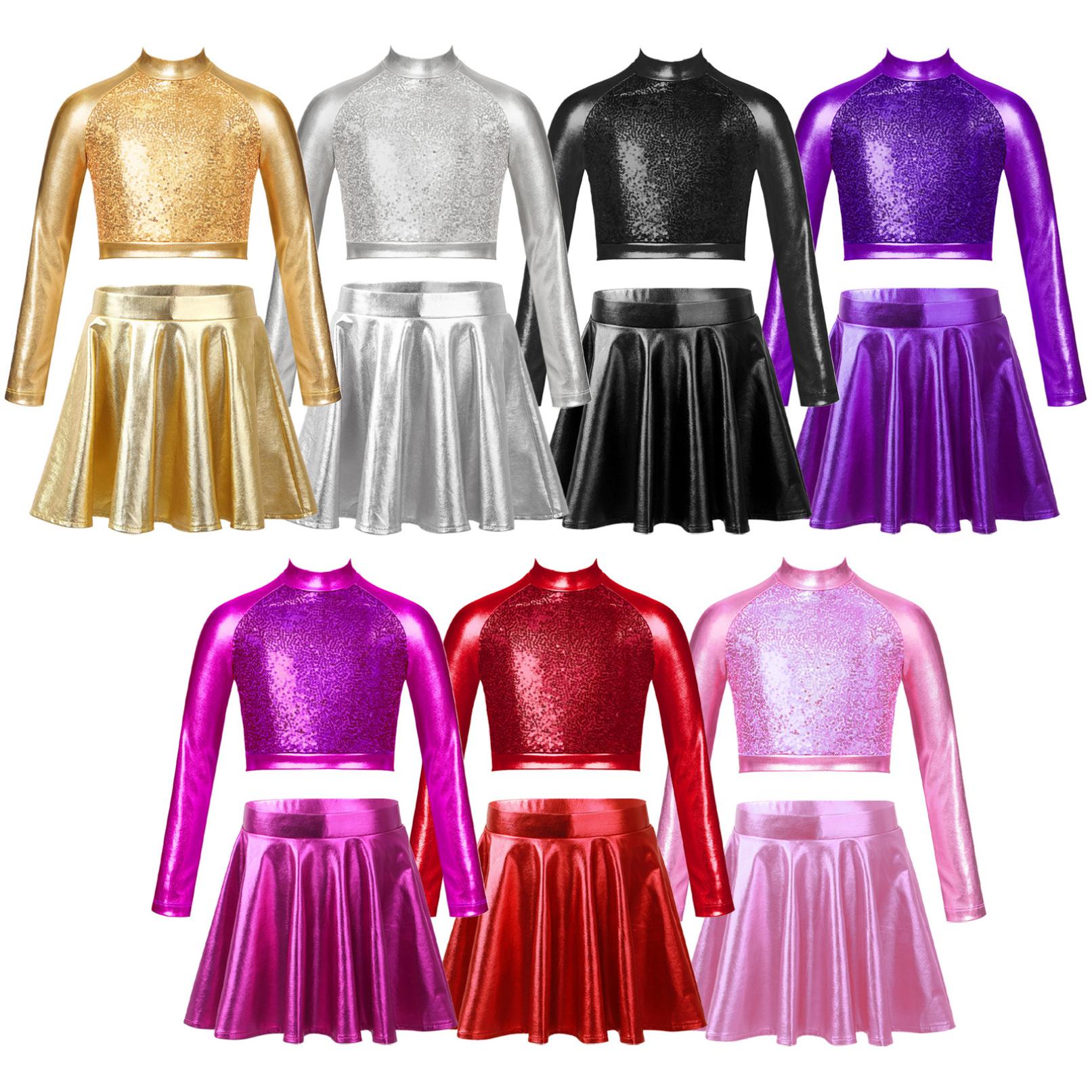 Barn Jenter Crop Top med skjørt Skinnende metallisk Jazz Hip Hop Performance Kostymer Todelte danseantrekk cm Svart