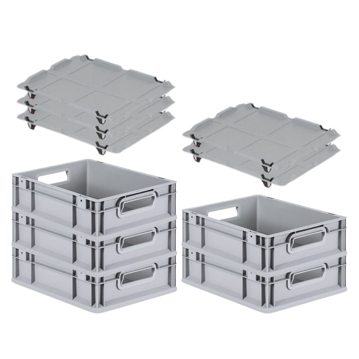 PROREGAL SparSet 5x Eurobox NextGen Economy mit Auflagedeckel & 4x Verschlüsse Schwarz, Griffe offen, HxBxT 12x30x40cm, 11L, Eurobehälter, Box
