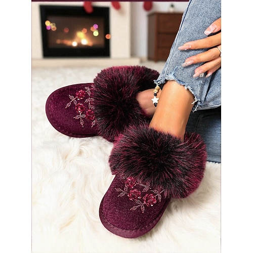 pantofole da donna in pelliccia sintetica color bordeaux con ricami floreali: comode e calde scarpe da interno per Natale, regali per le feste e relax invernale