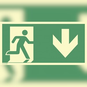 Notausgang rechts Pfeil unten, ISO 7010, Kunststoff, nachl., 160-mcd, 297x148 mm