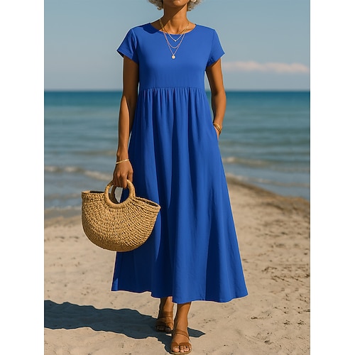 Per donna Blu Bianco Rosa Estate Primavera Abito Midi Misto cotone Abito Bianco Vestito Casual Essenziale Casual Quotidiano Vacanza Ferie Vestibilità comoda Colore Puro Girocollo