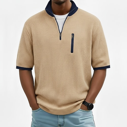 Per uomo Magliette Polo a Nido d'Ape Testurizzato All'aperto Casual Zip a un quarto Manica Lunga Moda Moderno Tinta unica Lavorato a maglia Primavera Autunno Vestibilità standard Beige Magliette