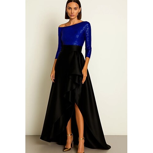 Linea ad A Asimmetrico Lunghezza al pavimento Abito da Sera Da principessa Abito formale Elegante Setoso Manica 3/4 Monospalla Matrimonio Formale Tasca Raso Con Paillettes con Volant Spacco