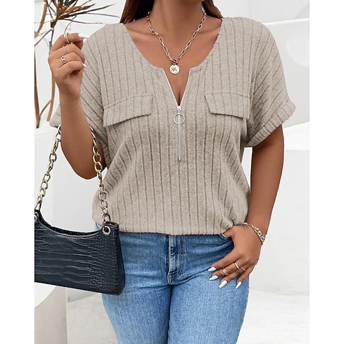 Per donna Maglietta Tinta unica Moda Classico Casual Manica Corta Scollo a V Top Regolari Quotidiano Uscire Weekend Zip a un quarto Blu Nero Vino Verde militare Cachi Estate Primavera