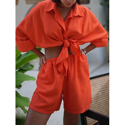 Per donna Camicia Set da due pezzi Set di Pantaloncini Manica Lunga Colletto a Camicia Tinta unica Moda Streetwear Casuale Quotidiano All'aperto Blu Bianco Blu marino Estate Vestibilità comoda