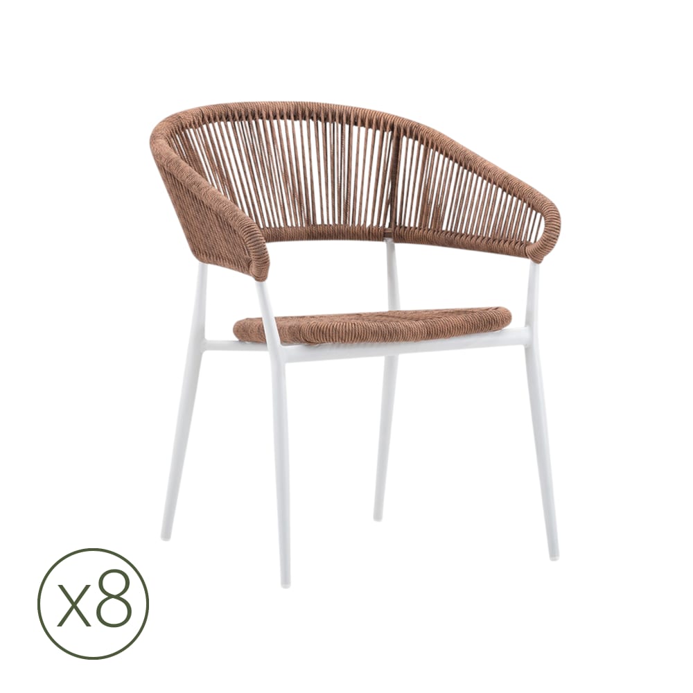 Set di 8 sedie in alluminio bianco con braccioli e corda marrone