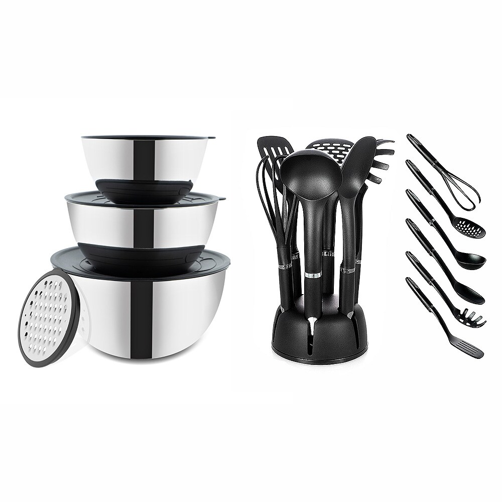 BEM Küchenset - Schüssel Set mit Deckel und Reibe, 3 Größe 1.8L 3.4L 5.5L und 6-tlg. Küchenutensilien Kochlöffel Küchenhelfer Set mit Behälter