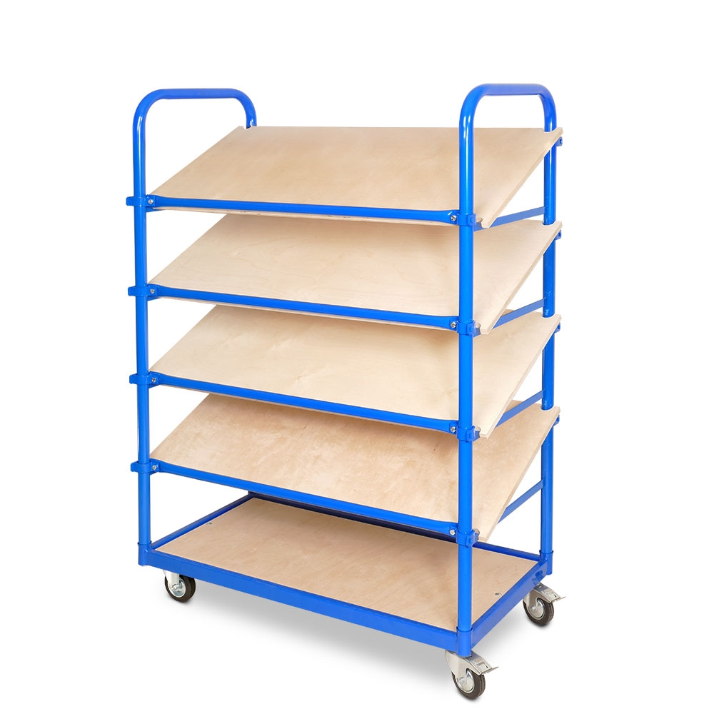 BRB Schrägboden-Regalwagen mit 5 Ebenen, BxTxH 1050x500x1450 mm, 2 Lenk- (mit Feststellbremse) u. 2 Bockrollen