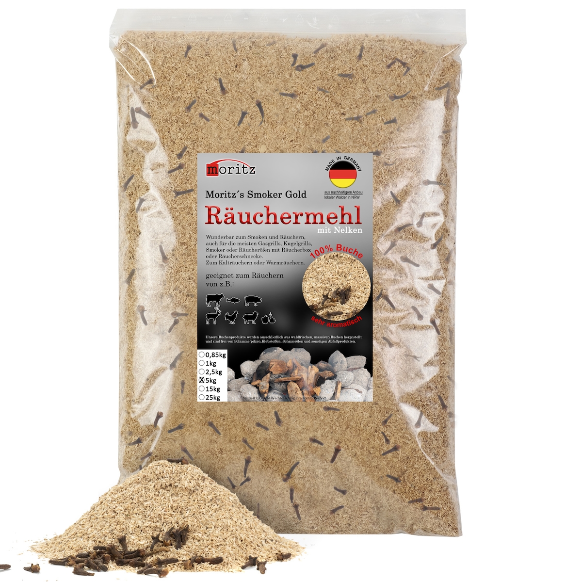 Moritz 5kg Räuchermehl Buche mit Nelke fein 0,5 -1 mm Räuchern I Kalträuchern von Fisch Fleisch Wurst Käse Gemüse auch für BBQ I Grill - Räucherspäne