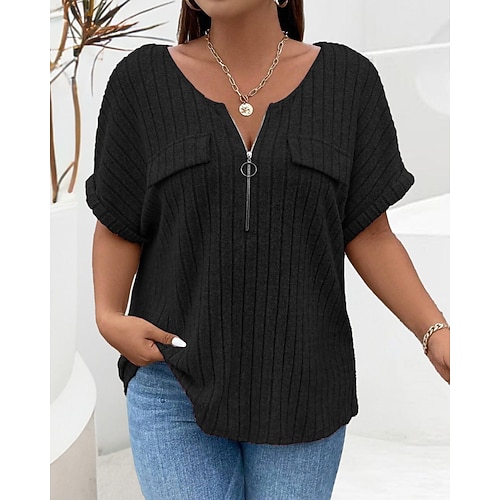Per donna Maglietta Tinta unica Moda Classico Casual Manica Corta Scollo a V Top Regolari Quotidiano Uscire Weekend Zip a un quarto Blu Nero Vino Verde militare Cachi Estate Primavera