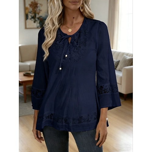 Per donna Blusa Tinta unica Elegante Casual Manica 3/4 Girocollo Top Regolari Quotidiano Pizzo Patchwork Nero Bianco Vino Blu marino Estate Primavera Autunno