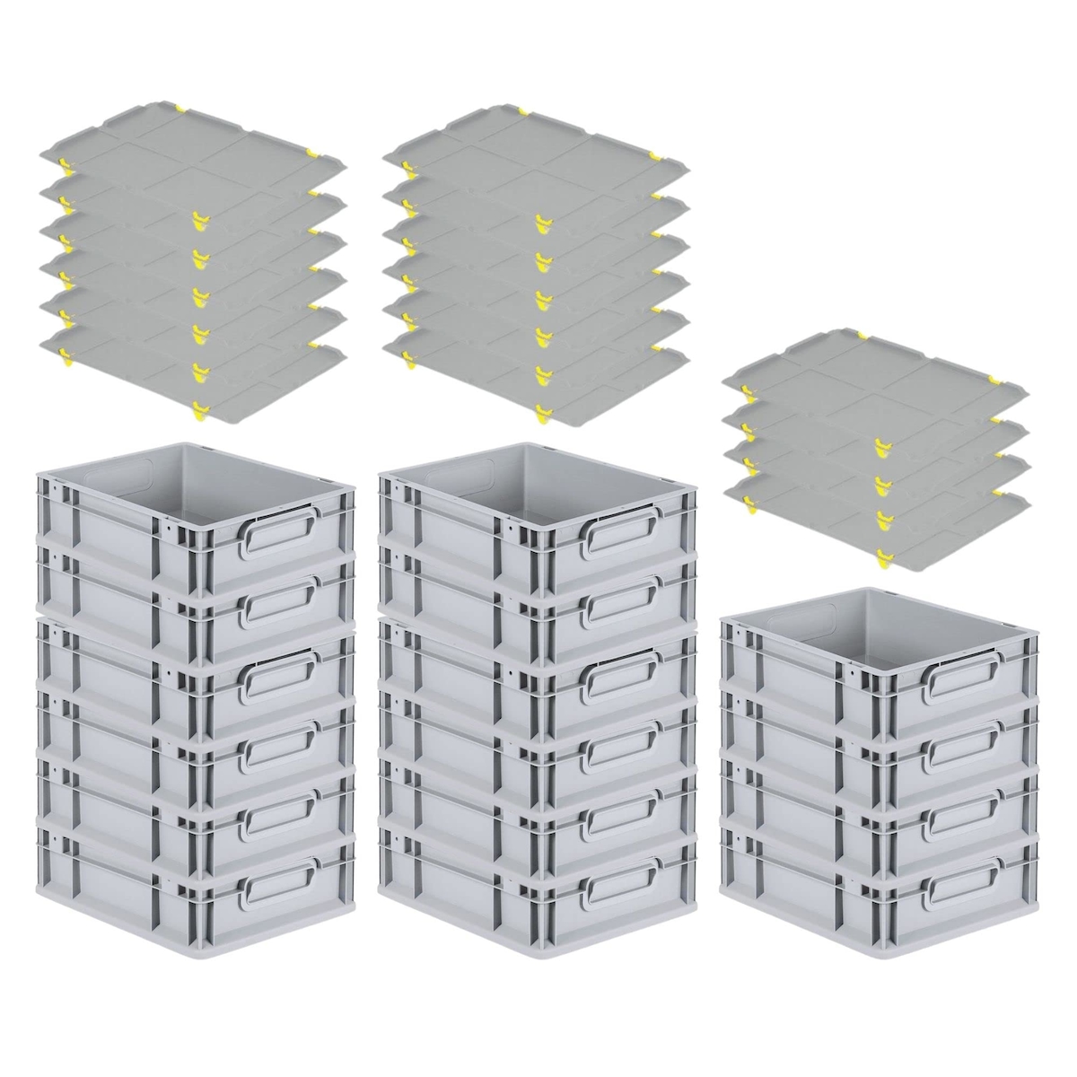 PROREGAL SuperSparSet 16x Eurobox NextGen Economy mit Auflagedeckel & 4x Verschlüsse Gelb, Griffe zu, HxBxT 12x30x40cm, 11L, Eurobehälter, Box
