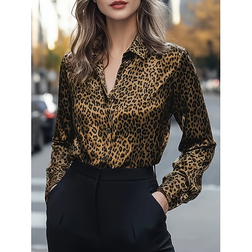 Per donna Blusa Bottoni Stampato Leopardo Elegante Casual Manica Lunga Colletto a Camicia Top Regolari Quotidiano Blu Argento Giallo Marrone Primavera Autunno