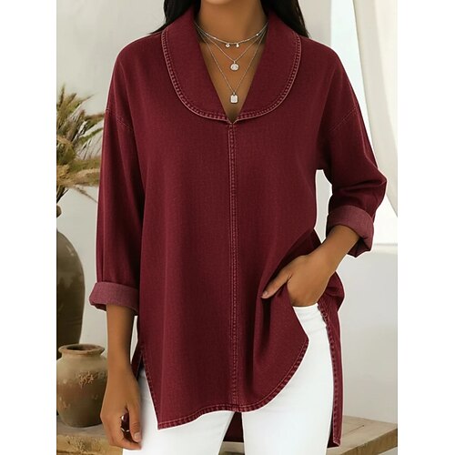 Per donna Camicia popover Camicia casual Blusa Tinta unica Vintage Casual Manica Lunga Collo ripiegato Top Regolari Quotidiano All'aperto Ferie Blu Nero Rosso Cachi Primavera Autunno Inverno