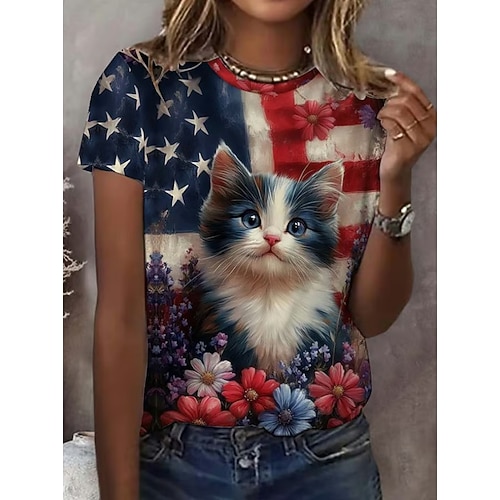 Maglietta Patriottica per il Giorno dell'Indipendenza Maglietta da Donna Grafica Bandiera Vintage Elegante Classica Maniche Corte Collo Tondo Top Regolari Quotidiano Weekend Stampa Blu Estate