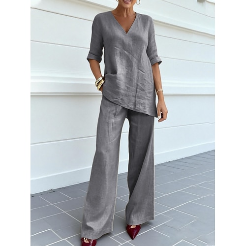 Per donna Moda Streetwear Elegante Misto cotone Set da due pezzi Set di Pantaloni Manica Lunga Scollo a V Tinta unica Coulisse Casuale Quotidiano All'aperto Blu Nero Marrone chiaro Primavera