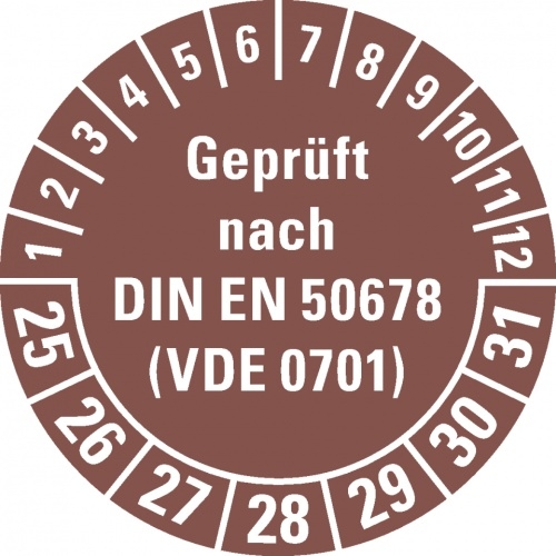 Dreifke® Prüfplakette geprüft nach DIN EN 50678(VDE 0701) 25-31, braun, Dokumentenfolie, Ø 30mm, 108/Heft