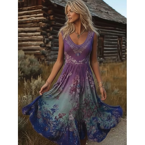 Abito Midi da Donna Boho Vestito Estivo A-Line Abito Slip Abito Pieghettato Vacanza Casual Spiaggia Vestibilità Regolare Grafica Floreale Etnica Senza Maniche V Collo U Collo Viola Estate Primavera