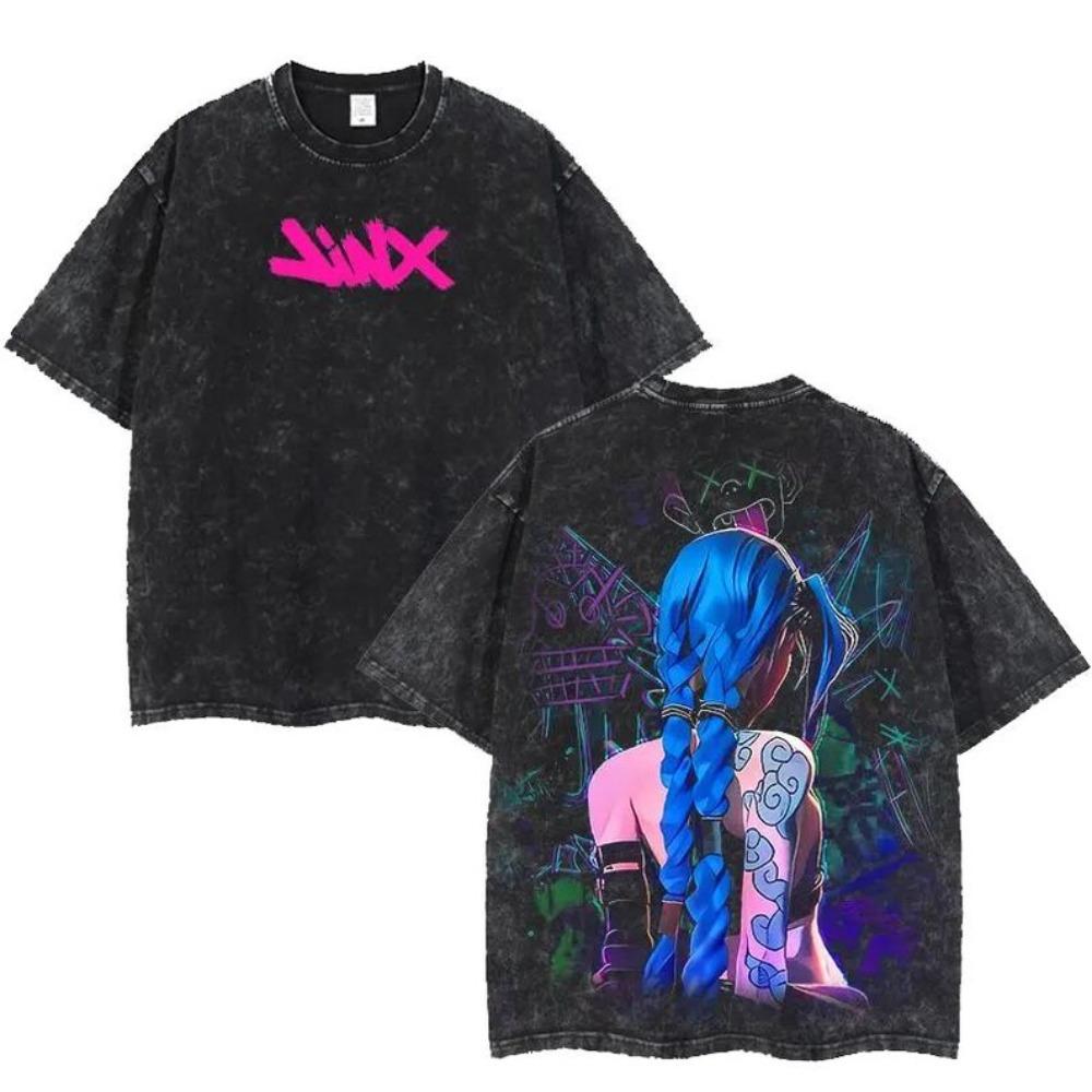 T-shirt Vintage Lavé Graffiti Néon Arcane Jinx, T-shirt Streetwear Unisexe pour Fan de League of Legends, Haut Décontracté 100% Coton à Manches Courte