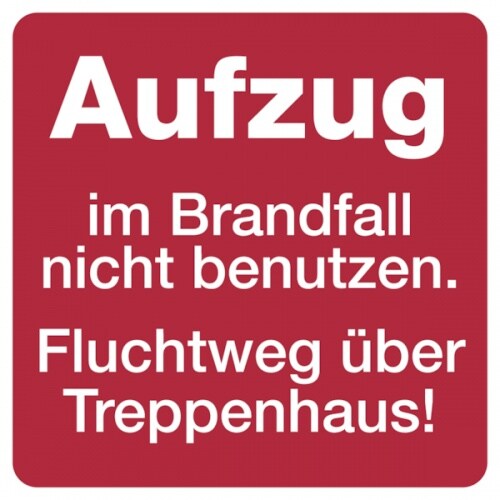 Hinweisschild, Aufzug im Brandfall nicht benutzen. Fluchtweg über Treppenhaus! - 200x200 mm Folie selbstklebend