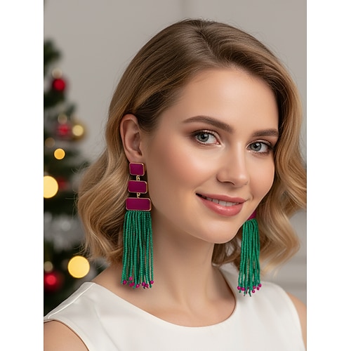 orecchini da donna con nappe di perline rosse e verdi - accessori di gioielleria natalizia per feste e abiti invernali
