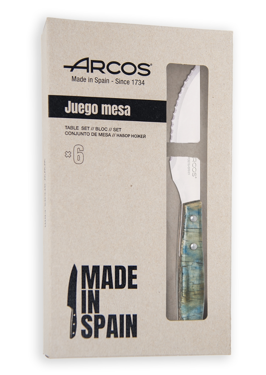 Arcos Serie Forest - Steakmesser-Set 6-teilig - NITRUM Edelstahlklinge von 110 mm - Wellenschliff - Griff aus komprimiertem Holz - Blaue Farbe