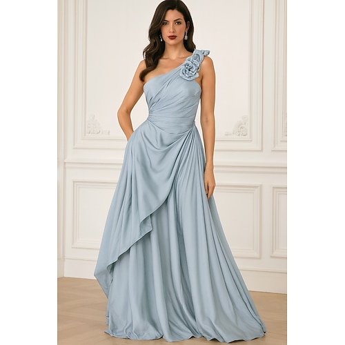 Linea ad A Lunghezza al pavimento Abito da Sera Elegante Setoso Senza Maniche Monospalla Matrimonio Formale Tasca Raso con Fiori 3D Tasca