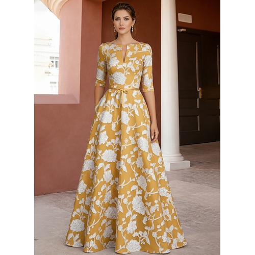 Linea ad A Lunghezza al pavimento Abito da cerimonia per signora Mezza Manica Scollo a V Regina Anna Elegante Vintage Formale Chiffon Raso con Fiori 3D Ricamo Fiore