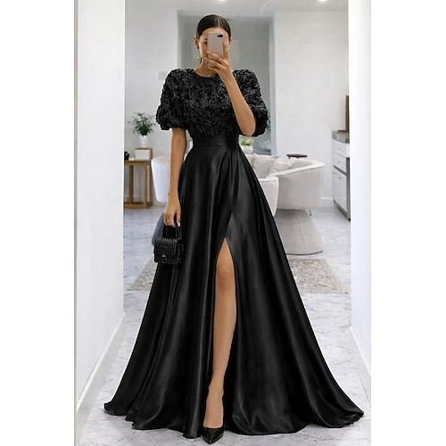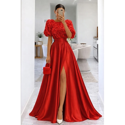 Linea ad A Lunghezza al pavimento Abito da Sera Elegante Abbellito Semi-formale / Cocktail Manica Corta Girocollo Festa serale Matrimonio Raso Pizzo con Fiori 3D Spacco