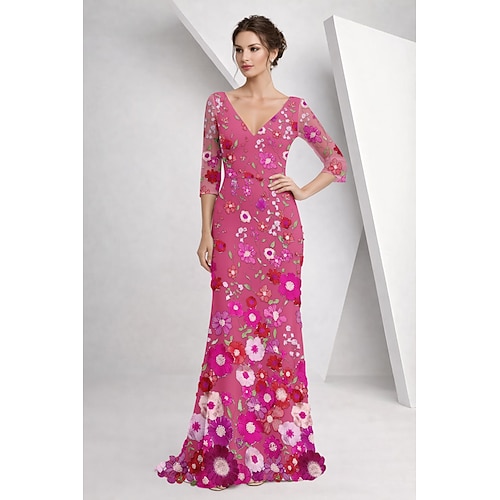 Linea ad A Lunghezza al pavimento Abito da cerimonia per signora Mezza Manica Scollo a V Elegante Vintage Formale Pizzo Tulle con Fiori 3D Ricamo Fiore