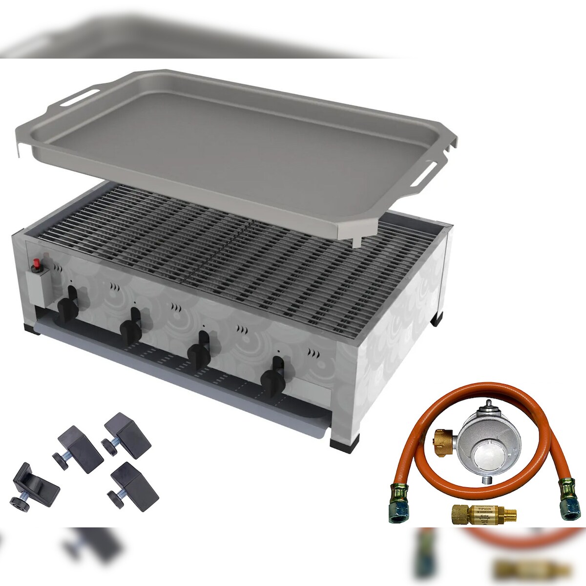 ChattenGlut ChattenTec Professional doppelwandiger Gastrobräter 4-flammig Tischgerät 16 kW, Flüssiggas 815x530x280 mm mit Gewerberegler und Rost und Pfanne