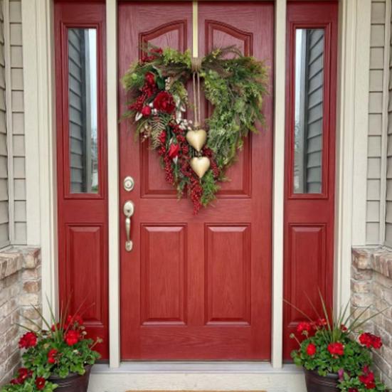Valentine's Day Farmhouse Heart Wreath for Front Door Rustic Faux Greenery Wreath with Red Roses Berries Vintage Heart Bell for Window Porch Decor