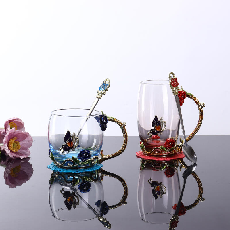 Enamel Rose Butterfly Decor Clear Glass Mug, Creative Gold-Plated Handle Tea Cup for Home Gift