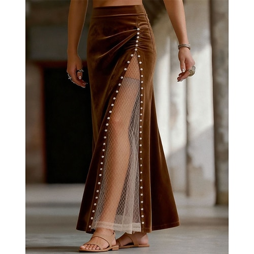 Per donna Gonna Gonna Lunga Elegante Vintage Casual Maxi Vita media Gonne Semplice Arricciato Patchwork Con perline Inelastico Quotidiano Ufficio / Carriera Marrone Primavera Poliestere