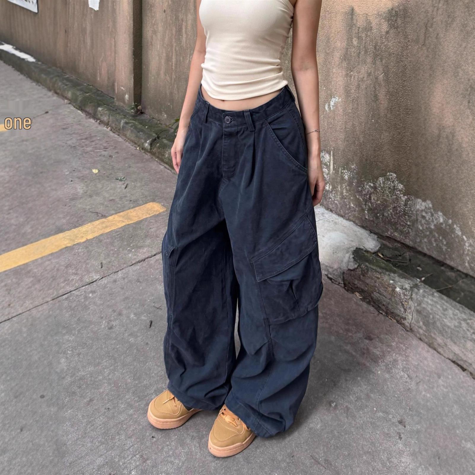 Women's American Retro Wide-Leg Cargo Pants: Autumn Hip Hop Style, Floor-Length, Multi-Pocket cm army green