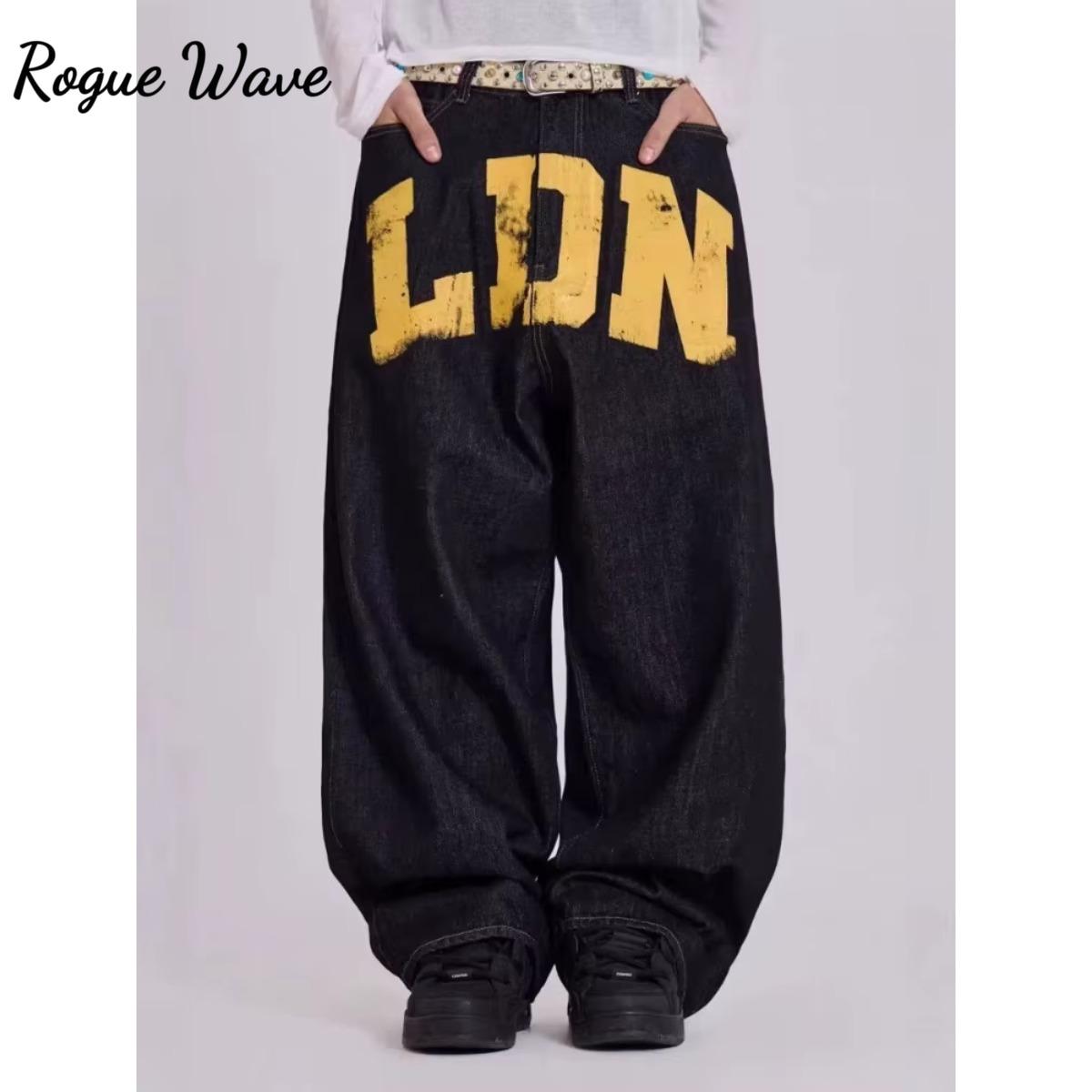 RogueWave American Vintage Letter Print Jeans Women's Black Gothic Y2k Loose Denim Pants Fashion Hip Hop Wide Leg Casual Streetwear cm black