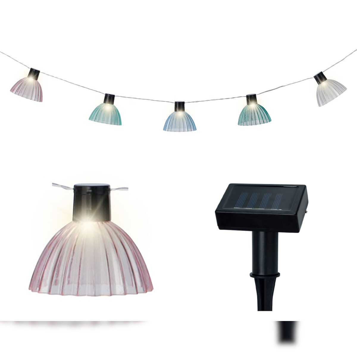Lumineo LED Solar Lichterkette Lampenschirme gerillt 4,5m - Solarlichterkette Solarkette Gartenbeleuchtung Partylichterkette Außen Garten Balkon Warmweiß