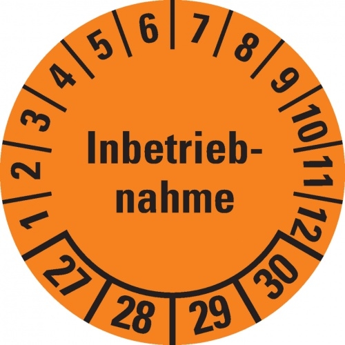 Dreifke® Prüfplakette Inbetriebnahme 27-30, orange, Dokumentenfolie, Ø 30mm, 18 St/Bogen