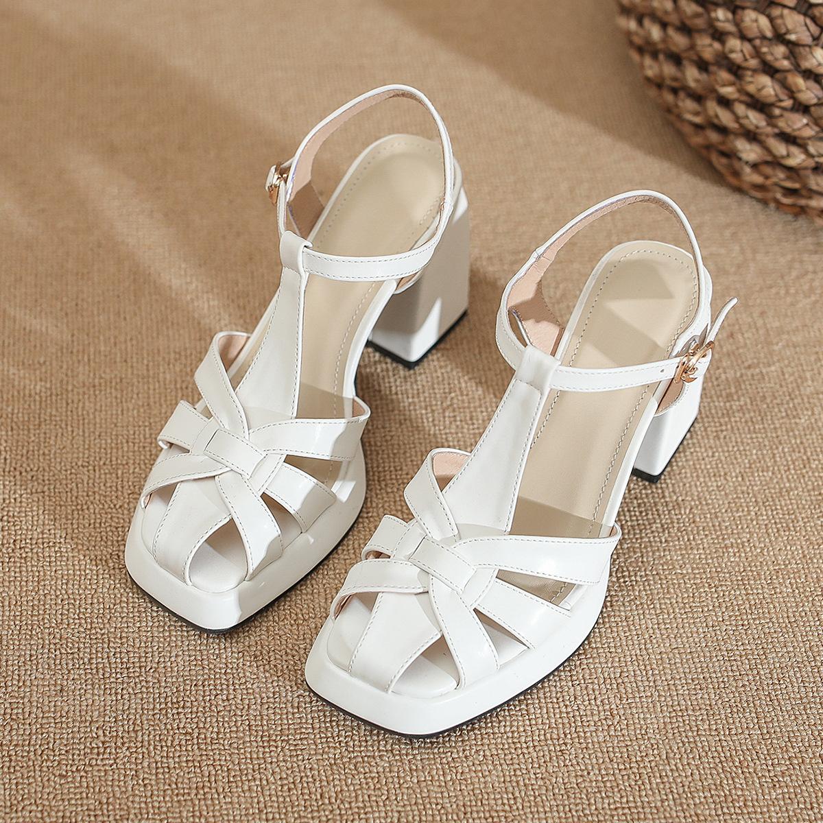 Roman sandals women's thick heel summer new one-word belt hollow bag head women's shoes French retro waterproof table high heels cm brown