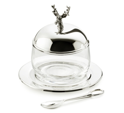 EDZARD Marmeladenglas Hirsch mit Untersetzer und Löffel, edel versilbert, Höhe 11 cm, ø 14 cm, ø Glas 10 cm