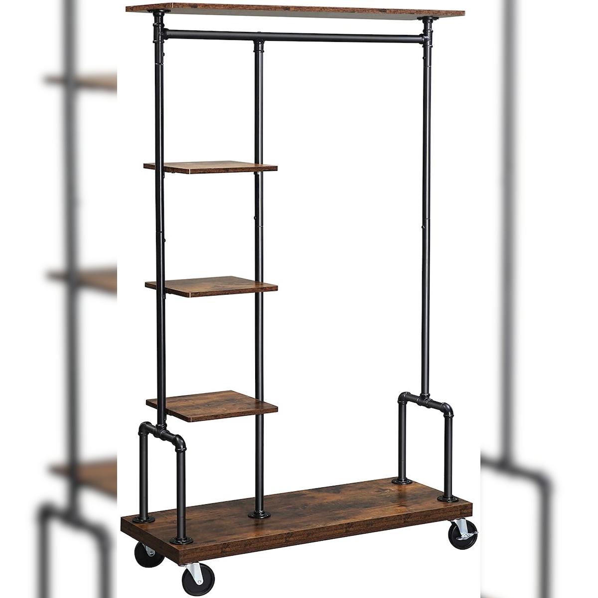 Garderobenständer auf Rollen, bis 90 kg belastbar, mit 5 Ablagen, Wasserrohr-Optik, Holzoptik, Vintage, dunkelbraun, schwarze Metallrohren